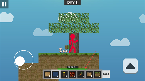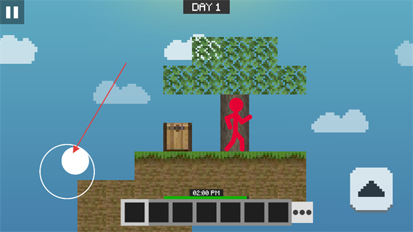 1、操控左侧虚拟摇杆移动火柴人,在空岛中探索,留意资源分布。
