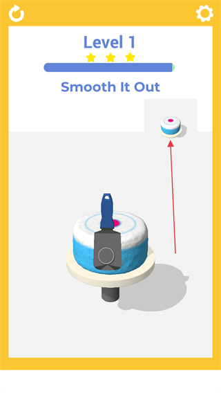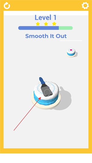 1、进入游戏,看到当前是Level1关卡,任务是SmoothItOut,滑动屏幕操控抹刀平整蛋糕表面奶油。