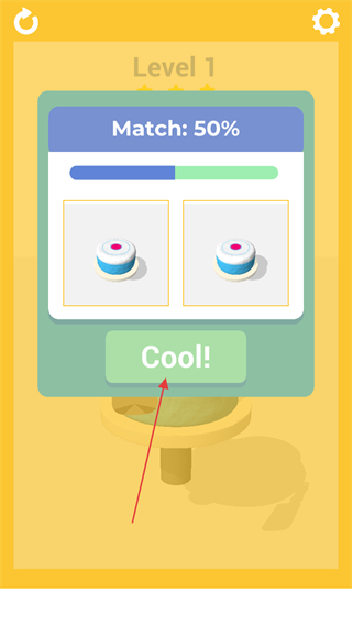 4、随后弹出对比界面,显示完成的蛋糕与目标蛋糕的匹配度,如Match:50%,点击Cool!按钮可进入下一关。