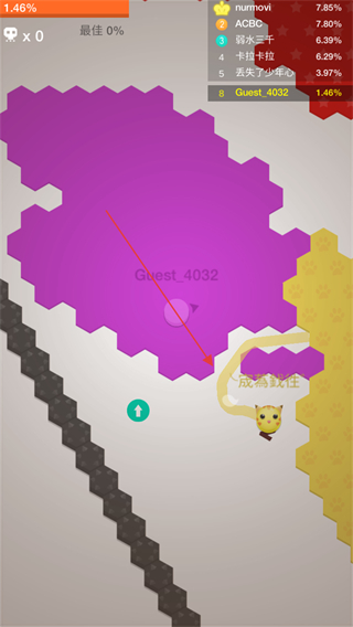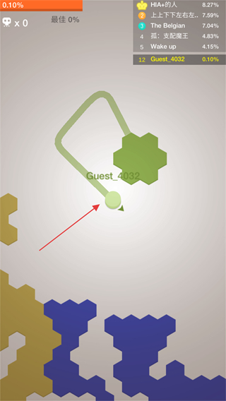 1、进入游戏,操控代表自己的Guest_4032圆圈,在六边形地图上移动来占领空白区域,扩大自己的势力范围。