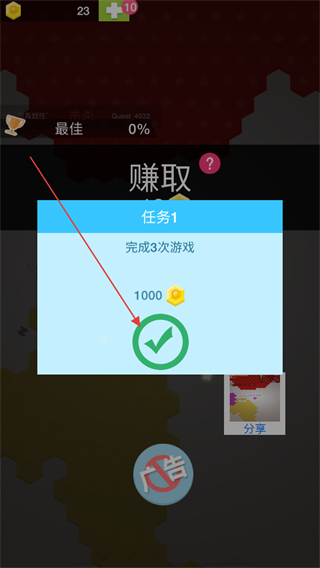 4、完成游戏任务,比如完成3次游戏,点击任务界面中的绿色对勾标志,领取相应奖励。