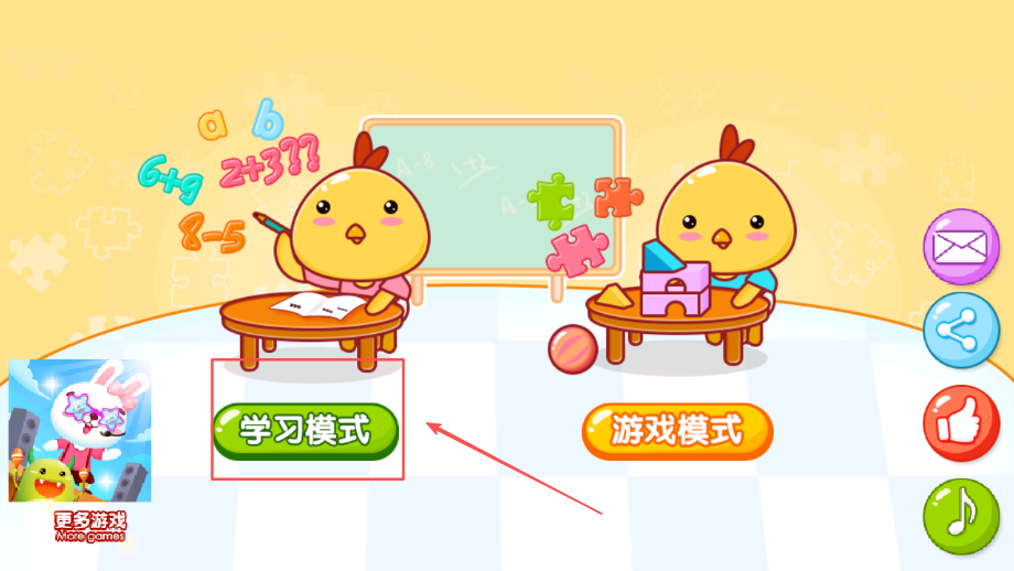 1、选择学习模块开始游戏,根据年龄选择拼音或数学等适合的内容,通过清晰分类的学习主题帮助孩子快速定位感兴趣的知识领域。
