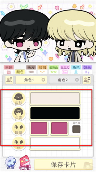 4、点击颜色,可对皮肤、头发、眼睛等进行颜色定制,搭配出个性化色彩组合。