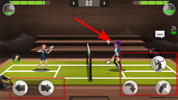 4、比赛中,可通过左下角左右箭头按钮控制角色前后移动,利用右下角击球按钮击球。