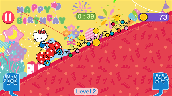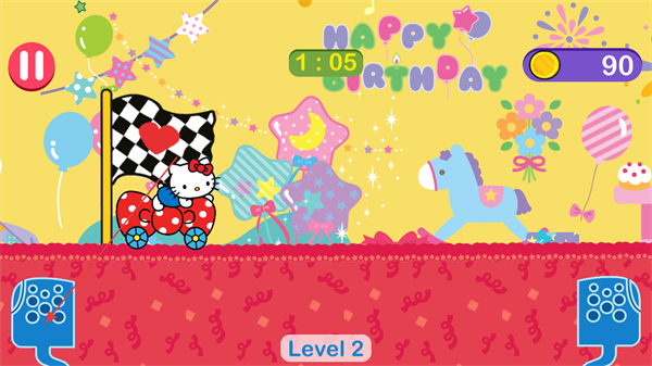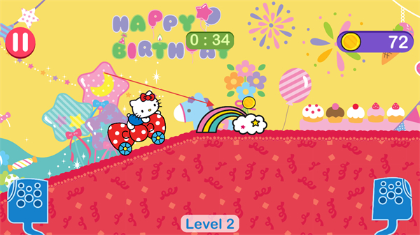 1、在Level2跑道上,驾驶凯蒂猫小车收集金币,利用彩虹道具获取额外金币。