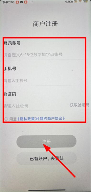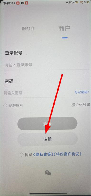 2、在商户登录注册界面,点击注册按钮,进入商户注册页面。