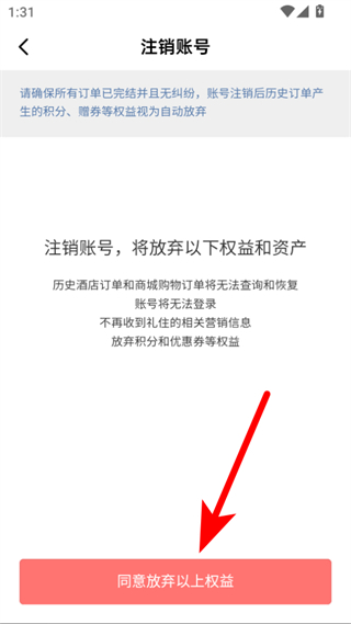 3、在注销账号说明页面,点击同意放弃以上权益按钮,进入短信验证页面。