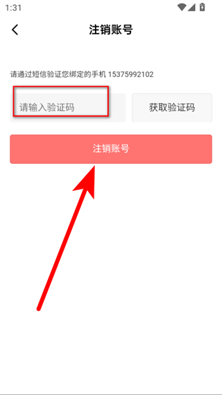 4、在短信验证页面,输入验证码后点击注销账号按钮,即可完成账号注销。