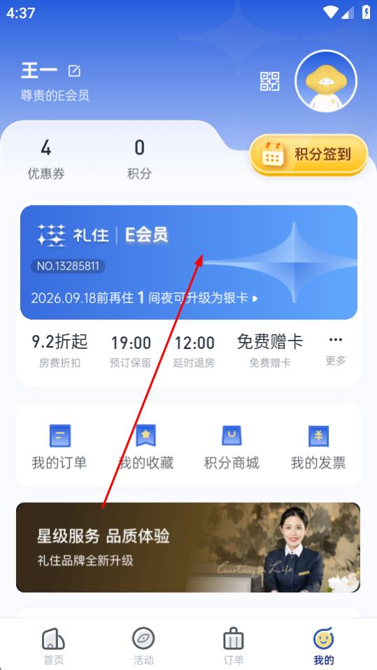 2、在我的页面,点击会员卡片区域。