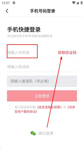 3、在手机号码登录页面,输入手机号,点击获取验证码。