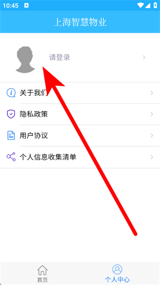 1、打开上海智慧物业,在首页点击底部个人中心。