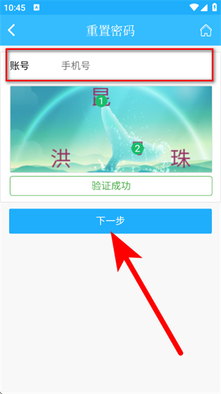 4、在重置页面,输入手机号,完成验证后,点击下一步。