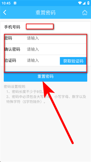 5、输入手机号码、新密码、确认密码,获取并输入验证码后,点击重置密码,完成操作。