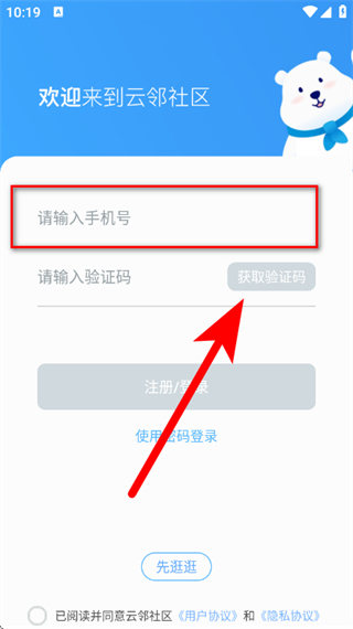 4、在注册页面,输入手机号后,点击获取验证码。