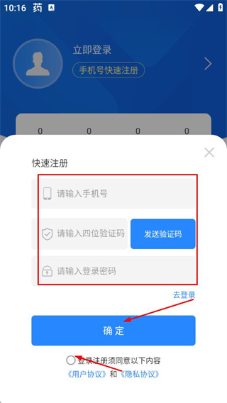 4、输入手机号、验证码、登录密码,勾选,点击确定。