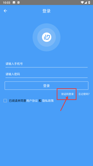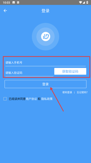4、在验证码登录信息填写页面,输入手机号和验证码,勾选协议后点击登录按钮,完成账号登录操作。