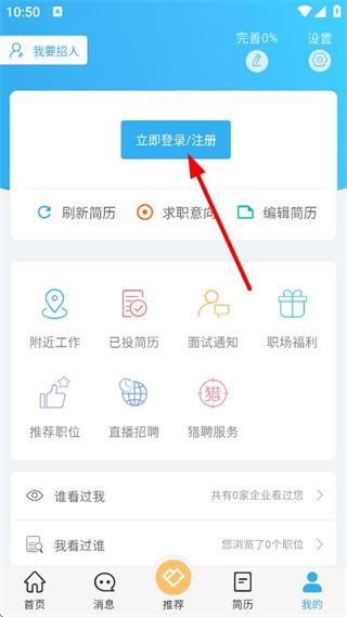 1、在求职APP首页,点击底部我的,进入个人页面。