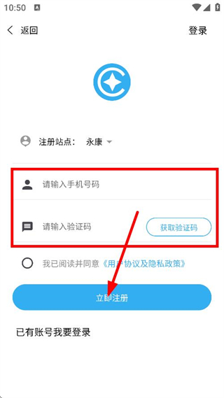 4、输入手机号码,获取验证码并输入,点击立即注册,完成注册操作。
