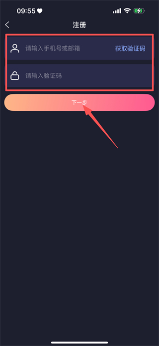 4、输入手机号或邮箱,获取验证码并输入,点击下一步,完成注册操作。
