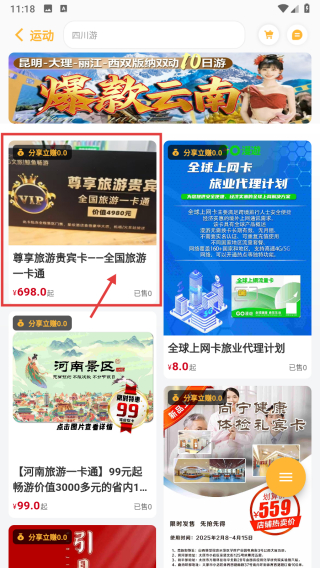 3、在运动类服务列表里,选择尊享旅游贵宾卡——全国旅游一卡通条目,进入产品详情页。