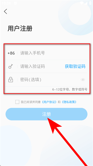 4、输入手机号、验证码,设置密码,勾选已阅读并同意后,点击注册,完成操作。