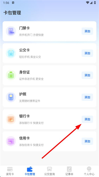 2、在卡包管理页面,找到银行卡选项,点击其右侧的添加按钮。