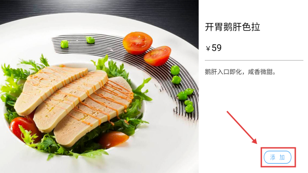 3、在菜品详情页,点击添加按钮,将菜品加入已点列表。