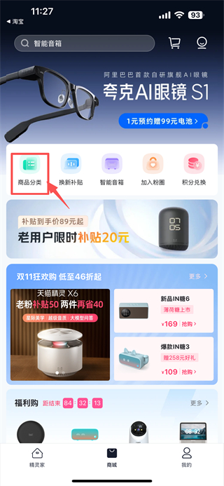 2、在商城页面,点击商品分类选项,进入商品分类页面。
