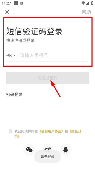 2、在短信验证码登录页面输入手机号,点击发送验证码。