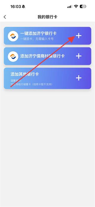 3、在我的银行卡页面,选择要添加的银行卡类型如一键添加济宁银行卡,点击右侧的加号按钮。