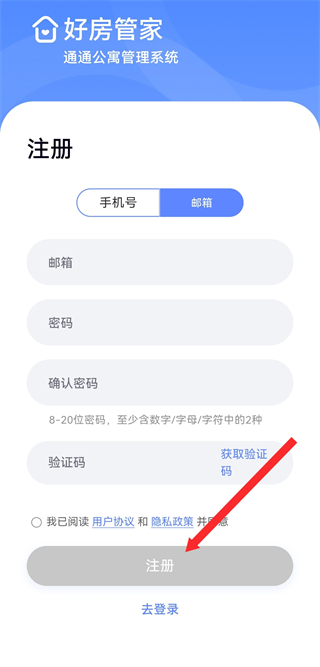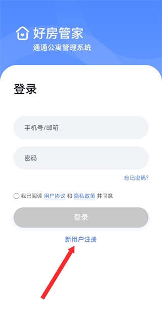 1、打开好房管家登录界面,点击新用户注册,进入注册页面。