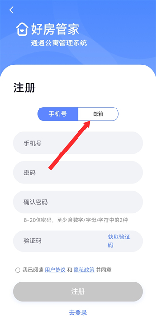 2、在注册页面点击邮箱,选择切换至邮箱注册的模式。