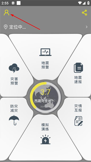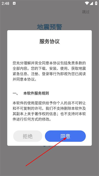 1、在地震预警服务协议弹窗中,点击同意,进入APP主界面。