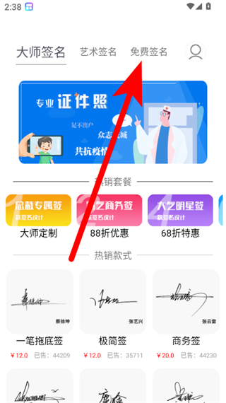 1、在艺术签名设计大师首页,点击免费签名选项,进入免费签名设计界面。