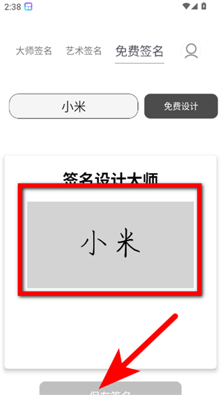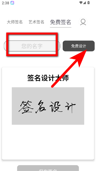 2、在免费签名设计界面,输入名字后点击免费设计按钮,生成签名样式。