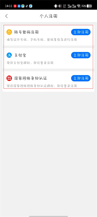 4、在个人注册页面选择注册方式,即可注册。
