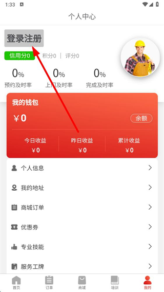 2、在个人中心页面,点击登录注册,进入登录界面。
