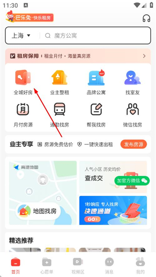 1、打开巴乐兔租房APP,在首页点击全城好房,进入房源列表页面。