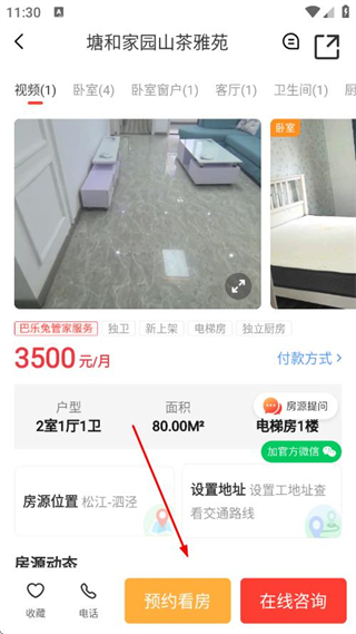 3、在房源详情页面点击预约看房,即可进行看房预约操作。
