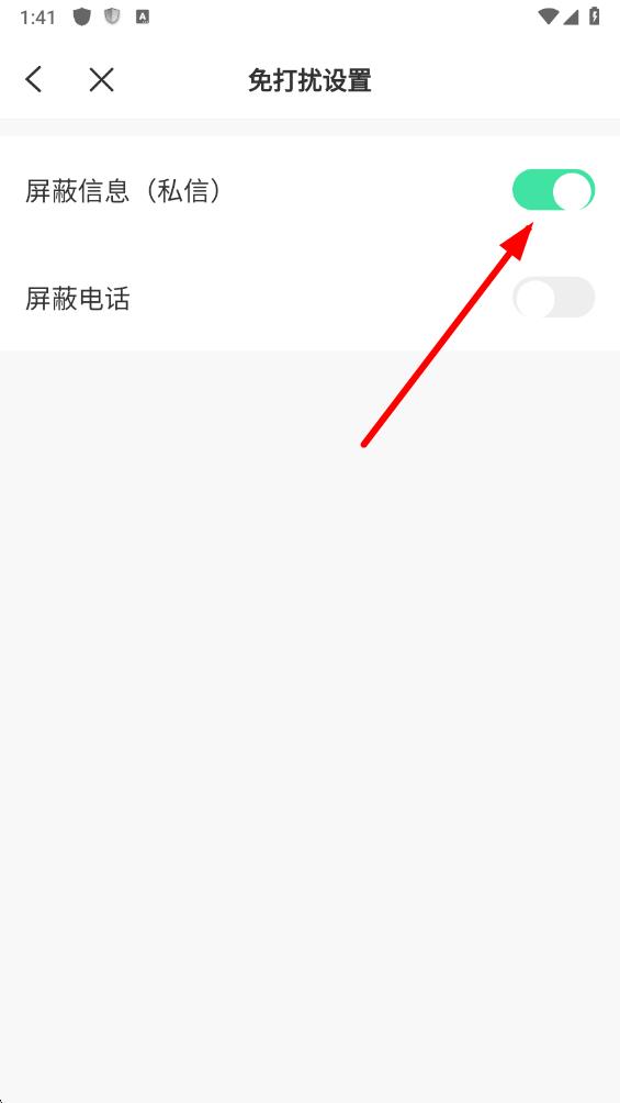 4、在免打扰设置界面里,找到屏蔽信息选项,点击其右侧的开关按钮,将开关打开,即可屏蔽消息。