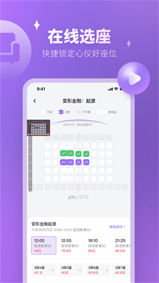 E票电影是专注电影票务服务的在线购票平台,支持全国影院电影场次查询与票务预订,选购时能实时查看影院场地座位分布,自由选择心仪位置锁定席位,彻底避免线下排队等候的麻烦,操作流程简洁直观,适配影迷日常观影规划需求,让购票选座更高效便捷,成为热爱电影人士的实用观影辅助工具。