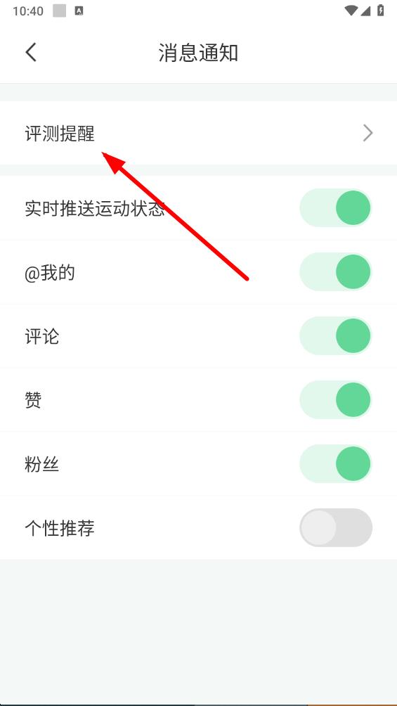 4、在消息通知界面中,点击评测提醒选项,进入评测提醒设置页。