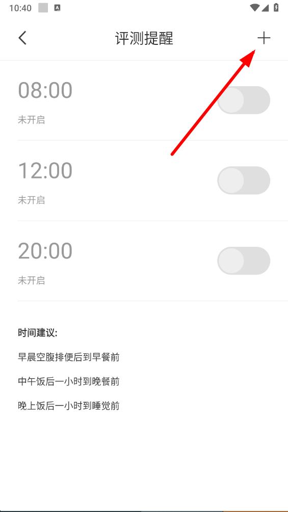 5、在评测提醒界面,点击右上角加号,进入设置评测时间。