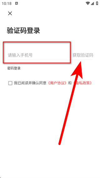 3、在登录页面,输入手机号,点击获取验证码。