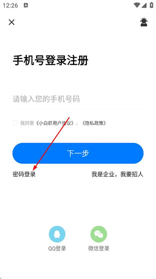 3、在登录选择页面,点击密码登录,进入账号密码登录页面。