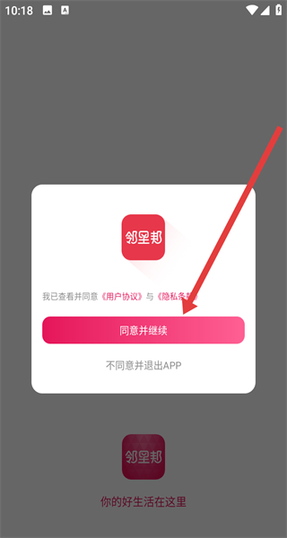 1、点击同意并继续按钮,同意邻里邦的《用户协议》与《隐私条款》,进入登录界面。