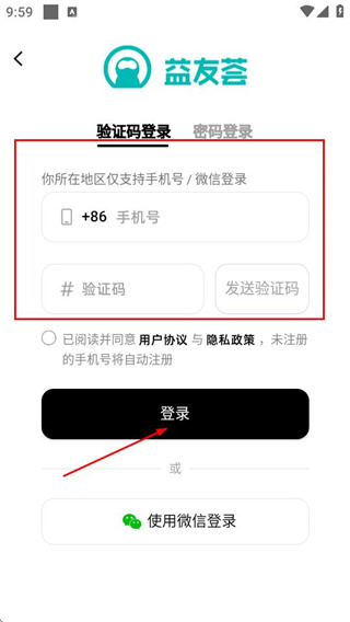 3、在验证码登录页面输入手机号、获取并填写验证码,勾选协议后点击登录,完成登录操作。