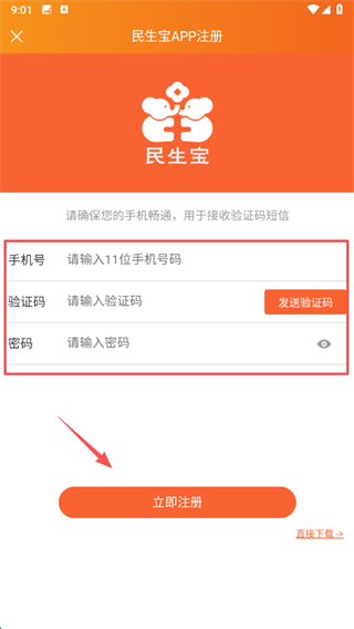 4、在民生宝APP注册页面,输入手机号、验证码和密码后,点击立即注册按钮,完成账号注册操作。