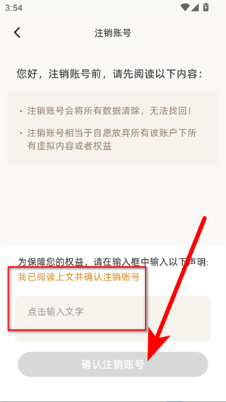 4、在注销账号页面,阅读相关提示后,在输入框中输入我已阅读上文并确认注销账号,然后点击确认注销账号按钮,即可完成账号注销。