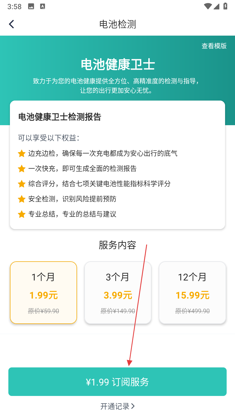 3、在电池检测界面,选择电池健康卫士服务,点击¥1.99订阅服务按钮。